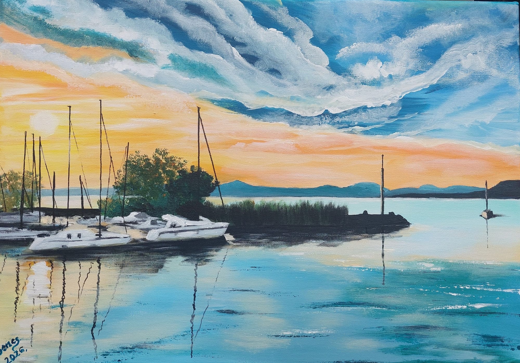A Balaton, mint belső tájZsuzsanna festészetének egyik legfontosabb ihletforrása a természet – különösen a magyar táj. És ha magyar táj, a Balaton elkerülhetetlenül megjelenik, ha nem is mindig konkrét formában. A tó fényei, a víztükör változékonysága, a part menti csend mind-mind visszaköszönnek a képein. Nem feltétlenül felismerhető panorámaként, inkább hangulatként: egy kék égből vörösbe átúszó naplemente , egy meleg sárgával megfestett nyári emlék, egy derengő horizont.A Balaton nála nem földrajzi hely, hanem lelki állapot. A nyugalom és az ébredés egyszerre. Az a pillanat, amikor az ember megáll a parton, és hirtelen érzi, hogy minden a helyére kerül – legalább egy rövid időre.